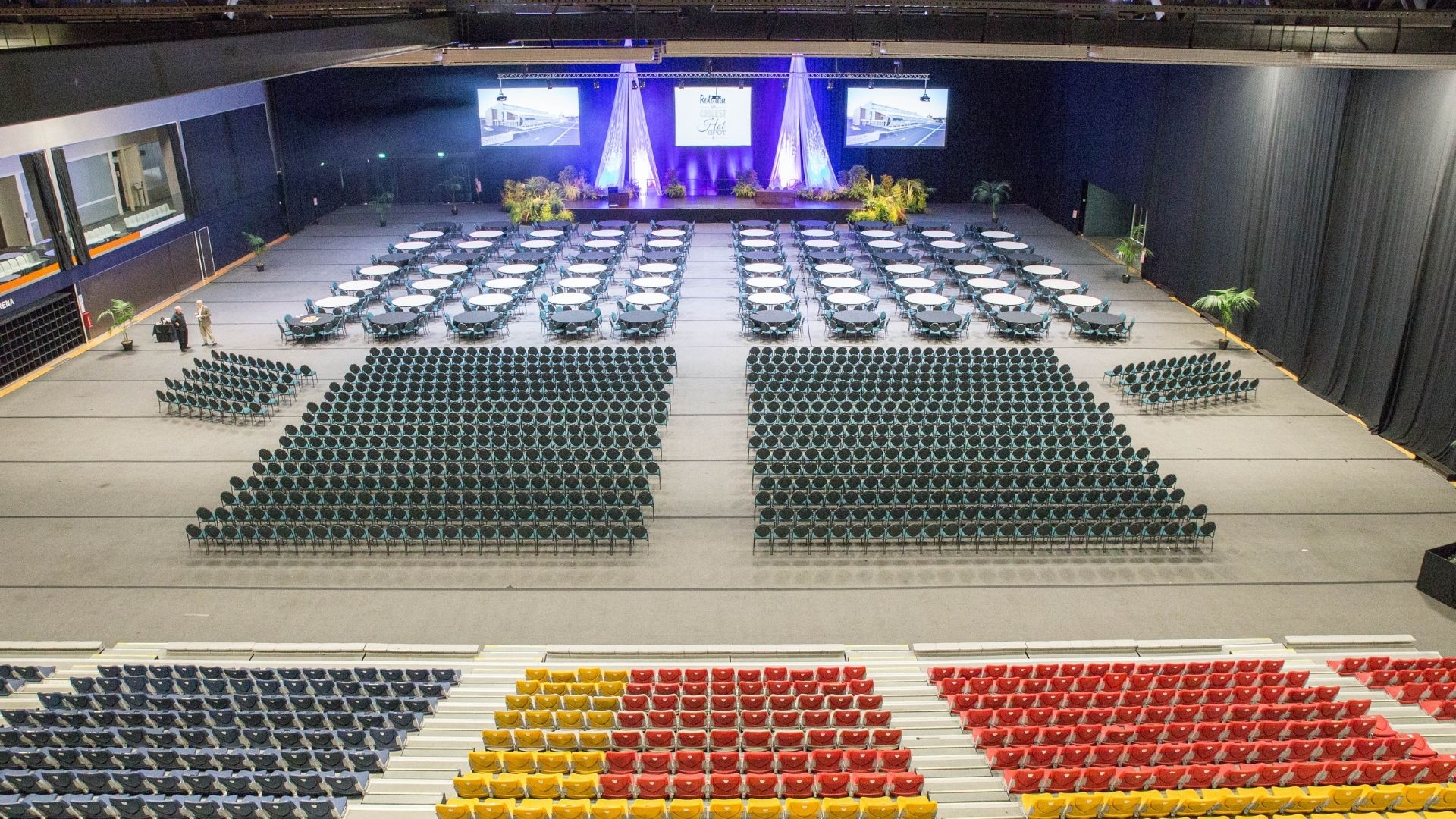 From the Grand Hall, step straight into the BayTrust Forum. With more than 930 square metres of space and a capacity of up to 850 people theatre-style, this stunning room truly has a point of difference. The red wall patterns reflect the surrounding Rotorua lakes and can be backlit for increased impact. With its unique design, high ceilings, and spacious feel, this embracing space is ideal for exhibitions, plenary sessions, workshops and banquet dinners.Unison Arena