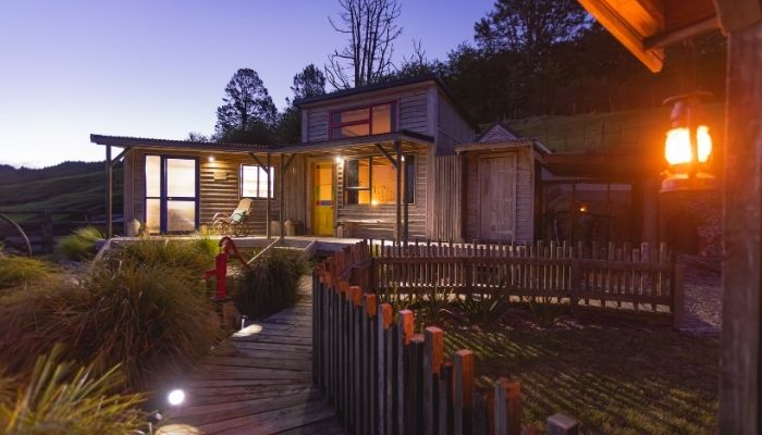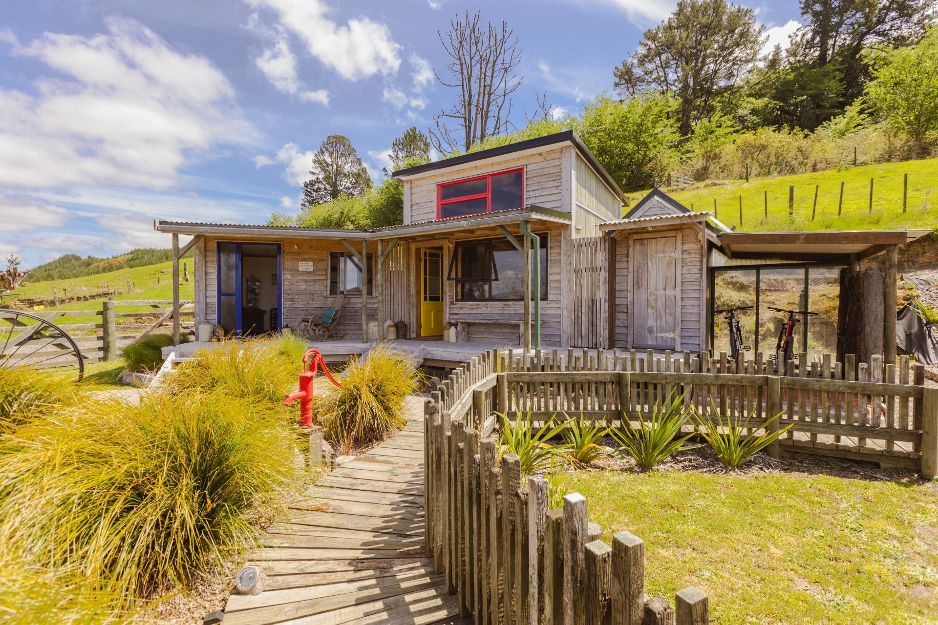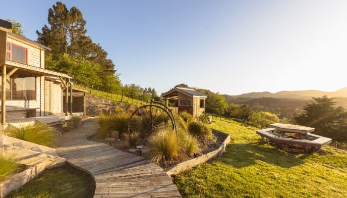 Set on a private 4.5-hectare organic hillside block, the hut blends beautifully into its surroundings of native plantings, redwood groves and open pasture. Enjoy sweeping 180-degree views across farmland, pine forest and the bike park beyond.
