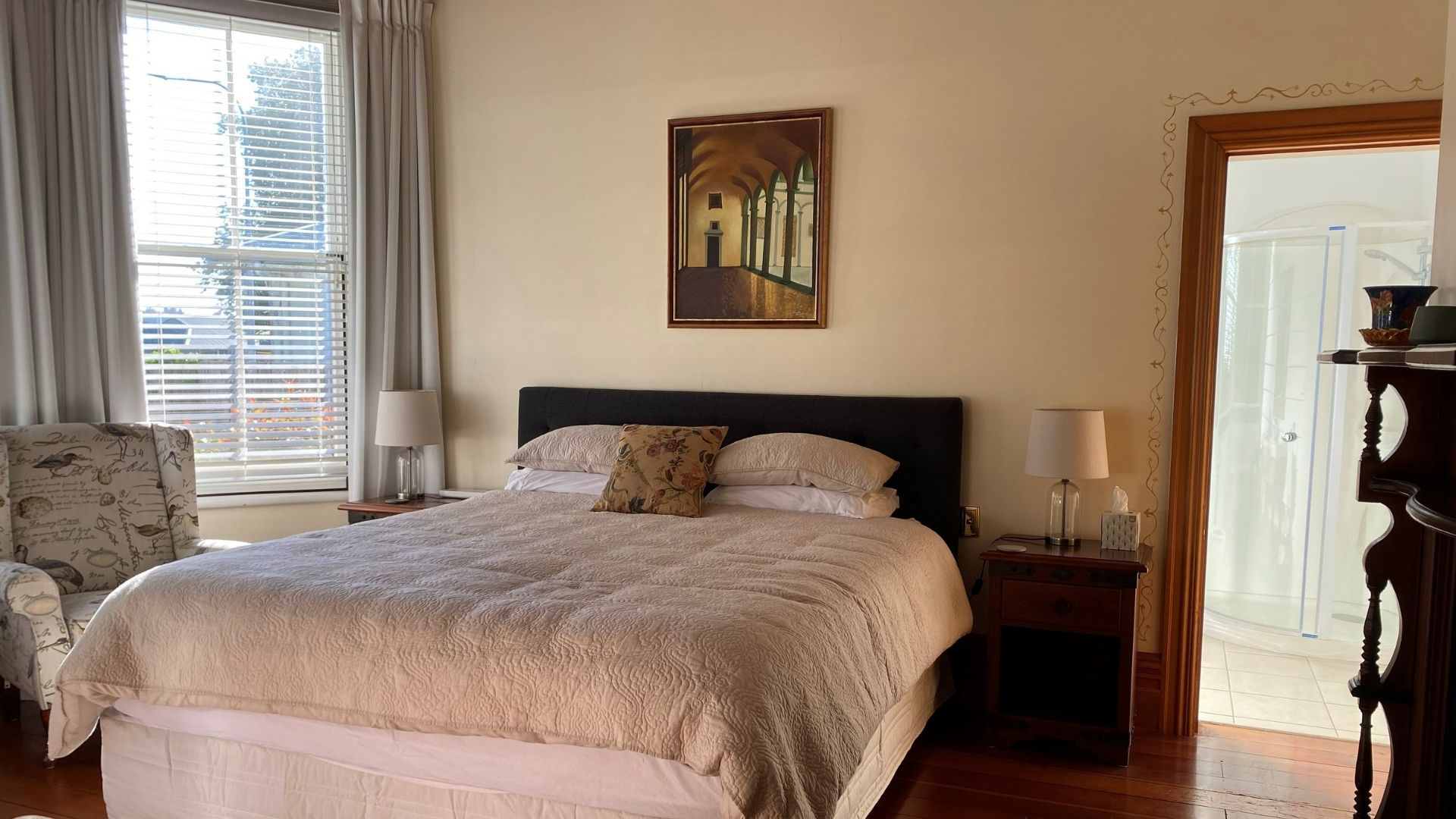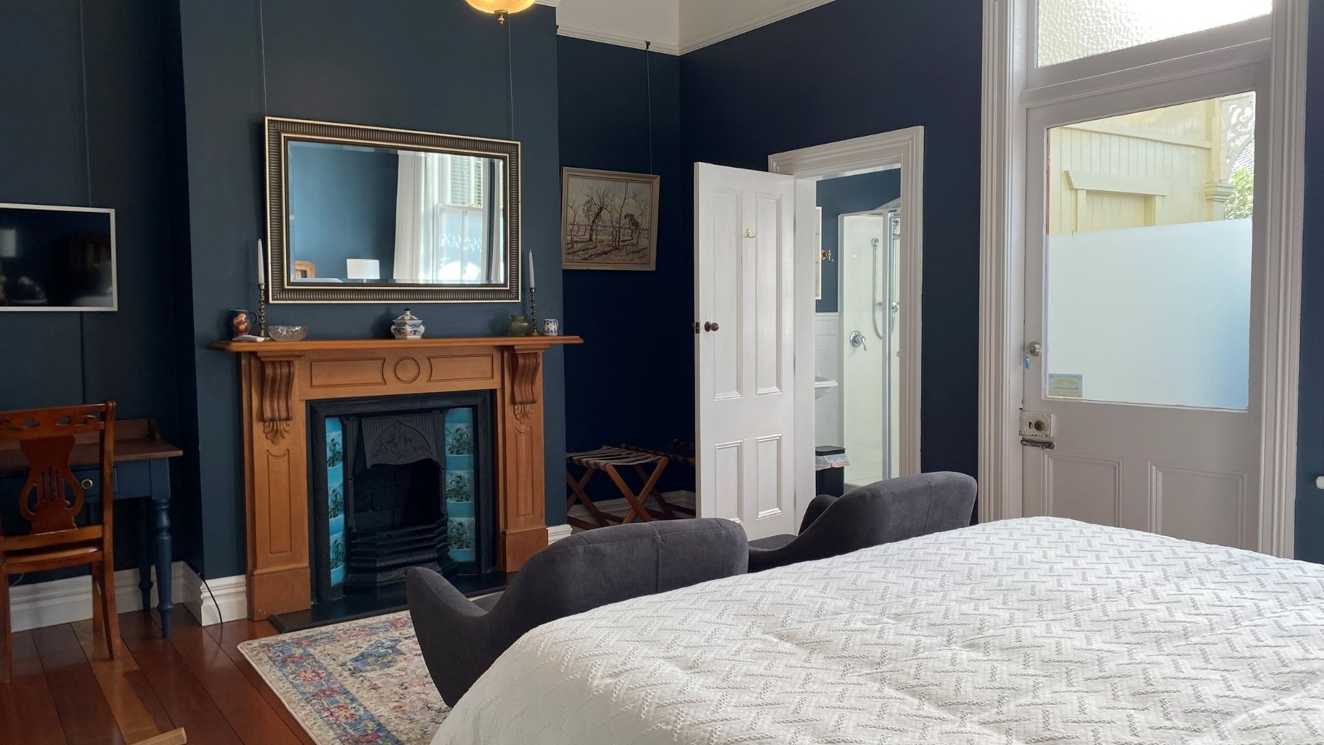 The Blue Room has a super king bed and historic fireplace. The bed can be separated into two singles, and another single bed can be added to the room.
