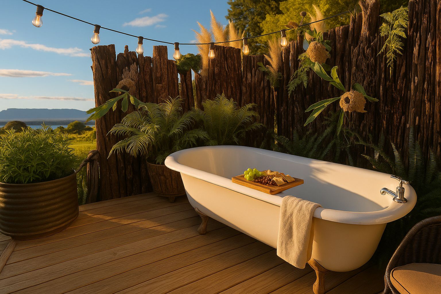 This beautifully appointed, fully self-contained hut features a luxurious queen bed, cosy sofa, a well-equipped kitchen, and a stylish bathroom with a shower, vanity, and flushing toilet. Step out onto your private deck to enjoy the Weber BBQ, a fire pit for stargazing evenings, and a romantic outdoor bath with a privacy screen—perfect for soaking while taking in the stunning views.