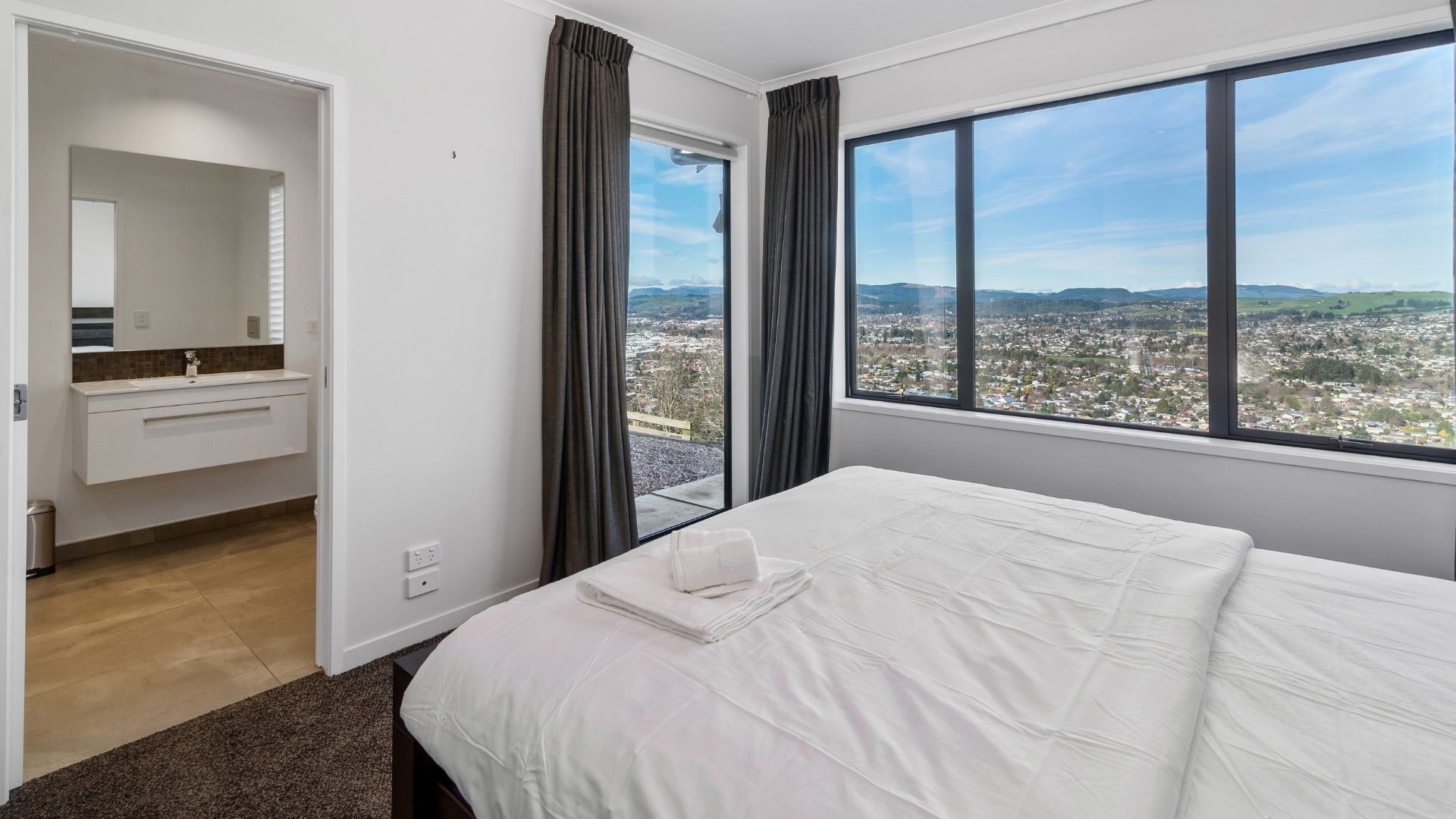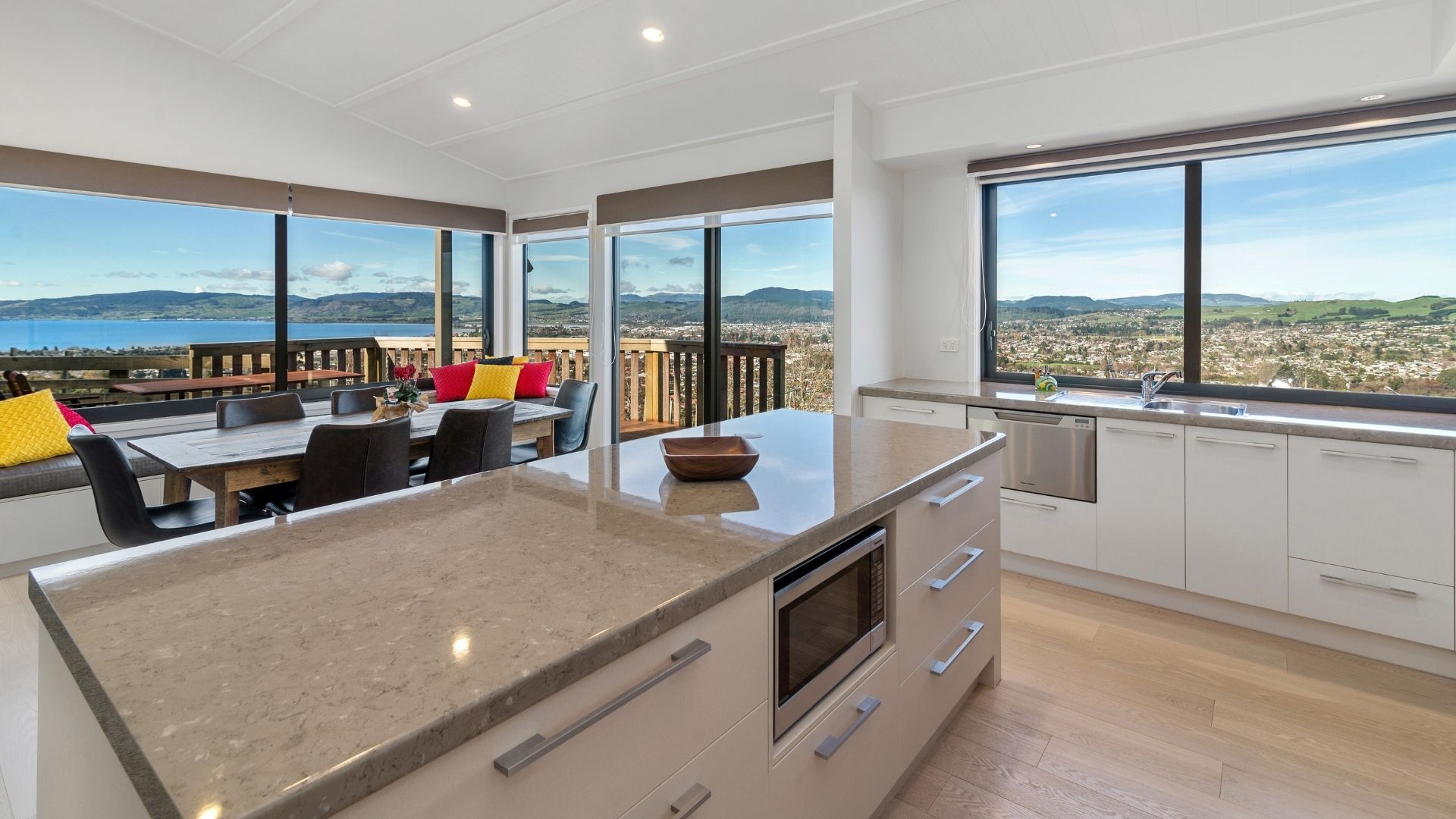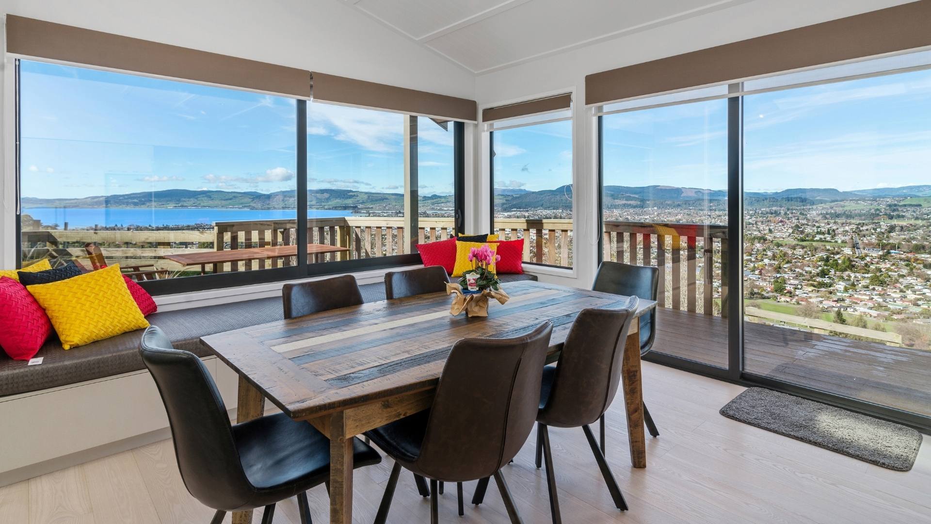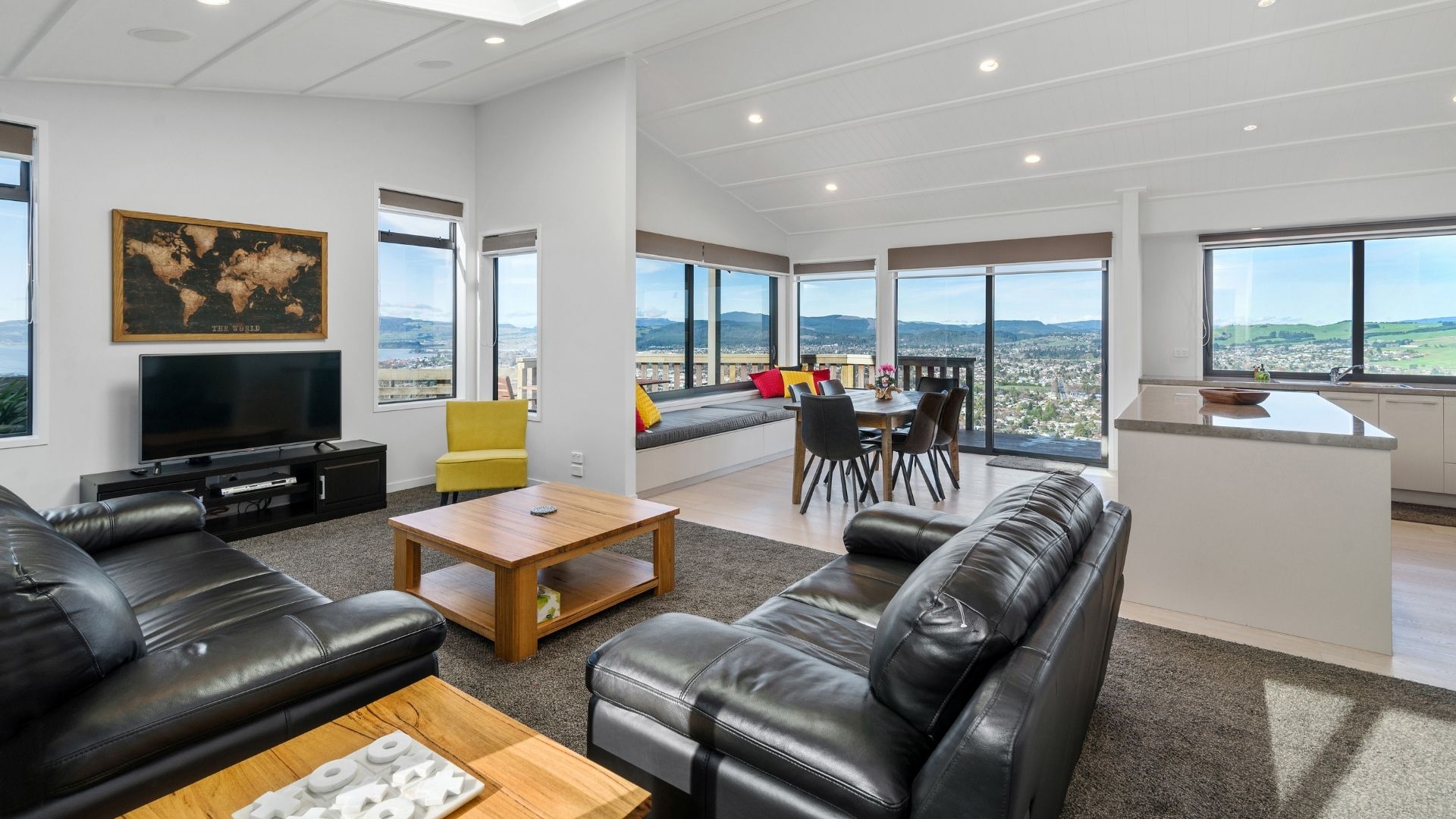 The Lookout is a stylish and modern holiday home set on an elevated site that offers panoramic views of Rotorua.