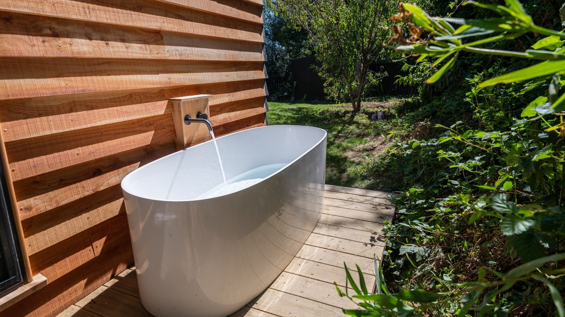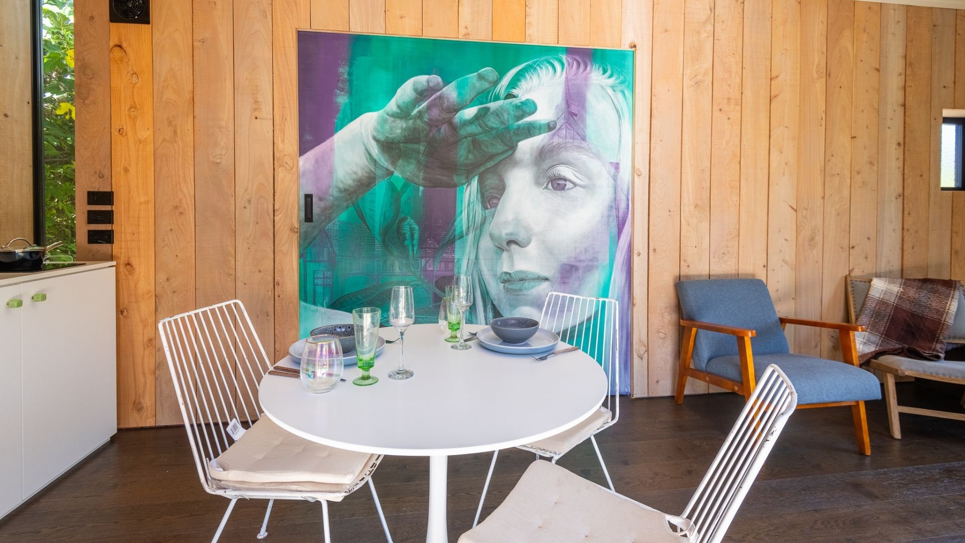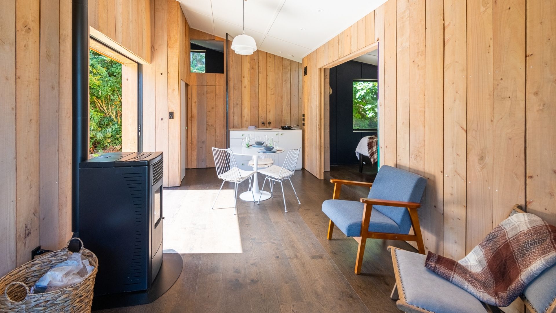 The one-bedroom holiday home features locally sourced macrocarpa boards inside and out, a stunning mural by national award-winning Rotorua artist Mark Noble, and outdoor bath.