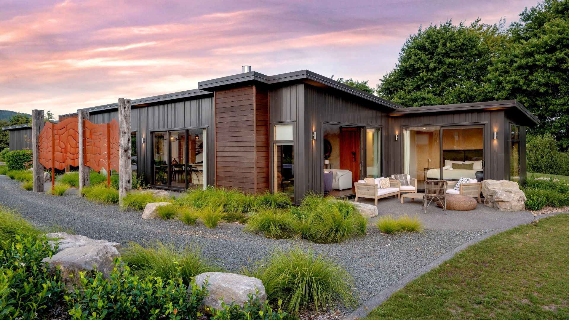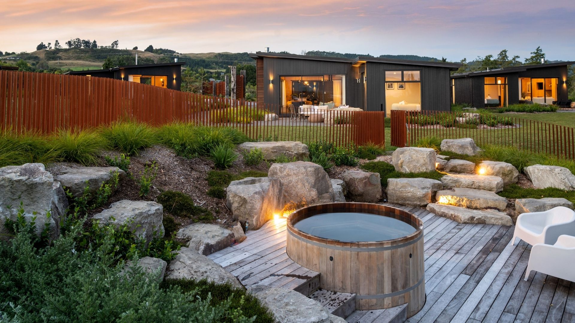 Nestled among boulders and native plantings are four individual neighbouring villas in a gorgeous rural setting. You'll love the original modern art throughout, rustic touches here and there, and the timeless feel of the purpose-built villas.