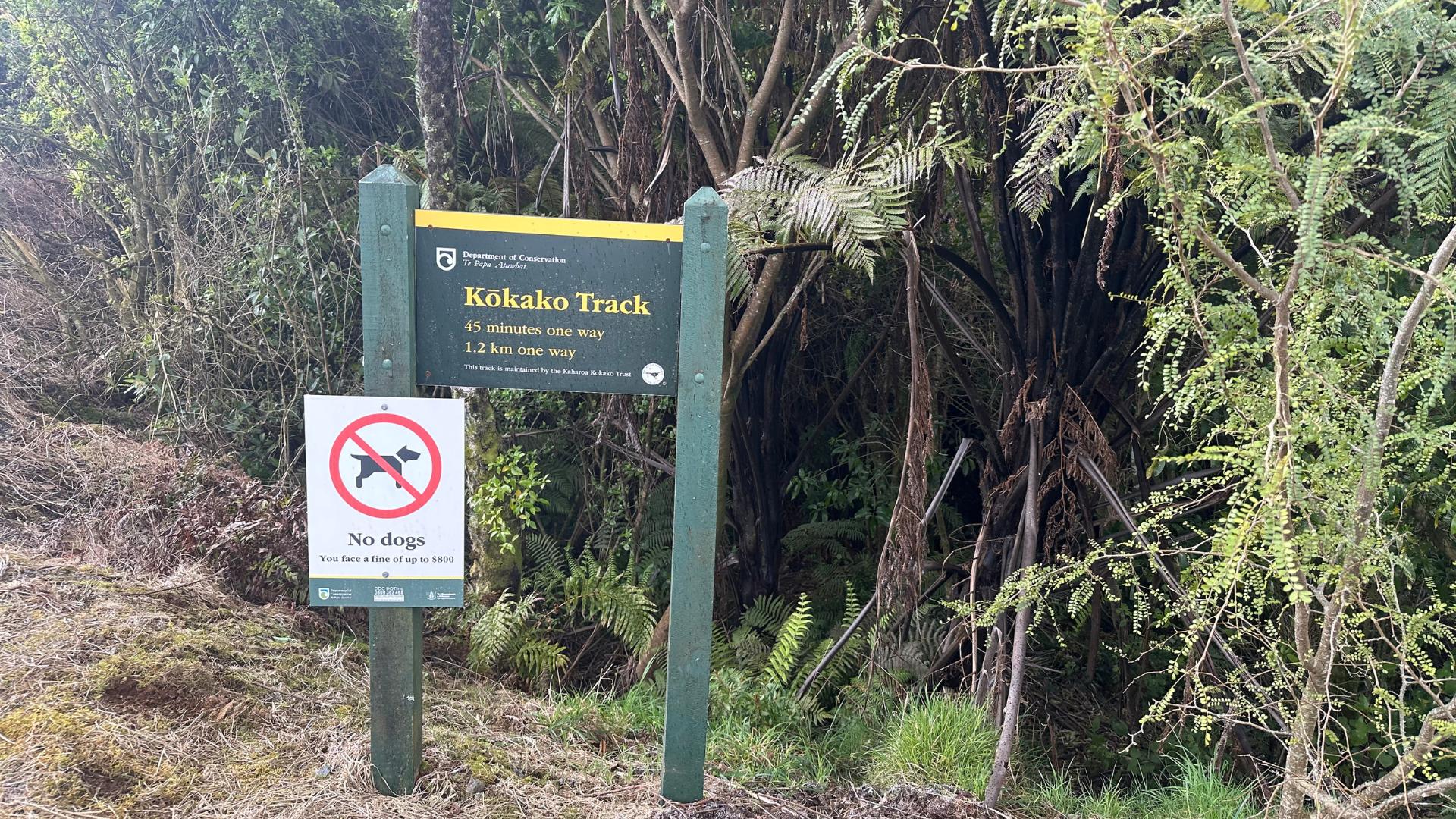 The Kaharoa Kōkako Track begins 600m along the road from the Kapukapu Road car park shelter, near the end of Kapukapu Road. There is a small trailhead car park, for 1 or 2 cars, at the start of this public walking track. If the trailhead car park is full, simply park at the Kapukapu Road car park shelter and walk along the road to the start of the track.