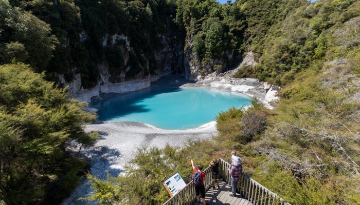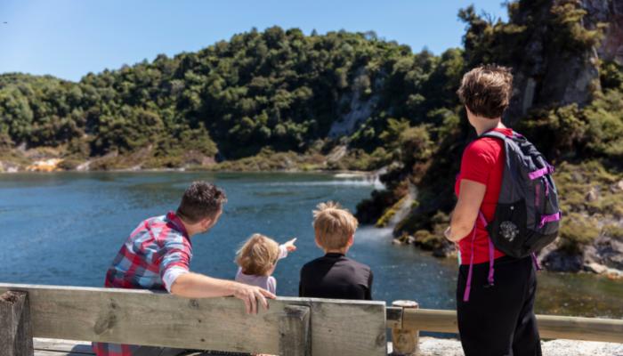 Waimangu Volcanic Valley is located approximately 25km south of the Rotorua city centre. While it’s an easy drive through the picturesque countryside, a daily, round-trip shuttle service is available for $99 per person from the Rotorua isite Visitor Information Centre – it’s better for our planet and makes it easier for families and groups to get to the same place easier and all together.