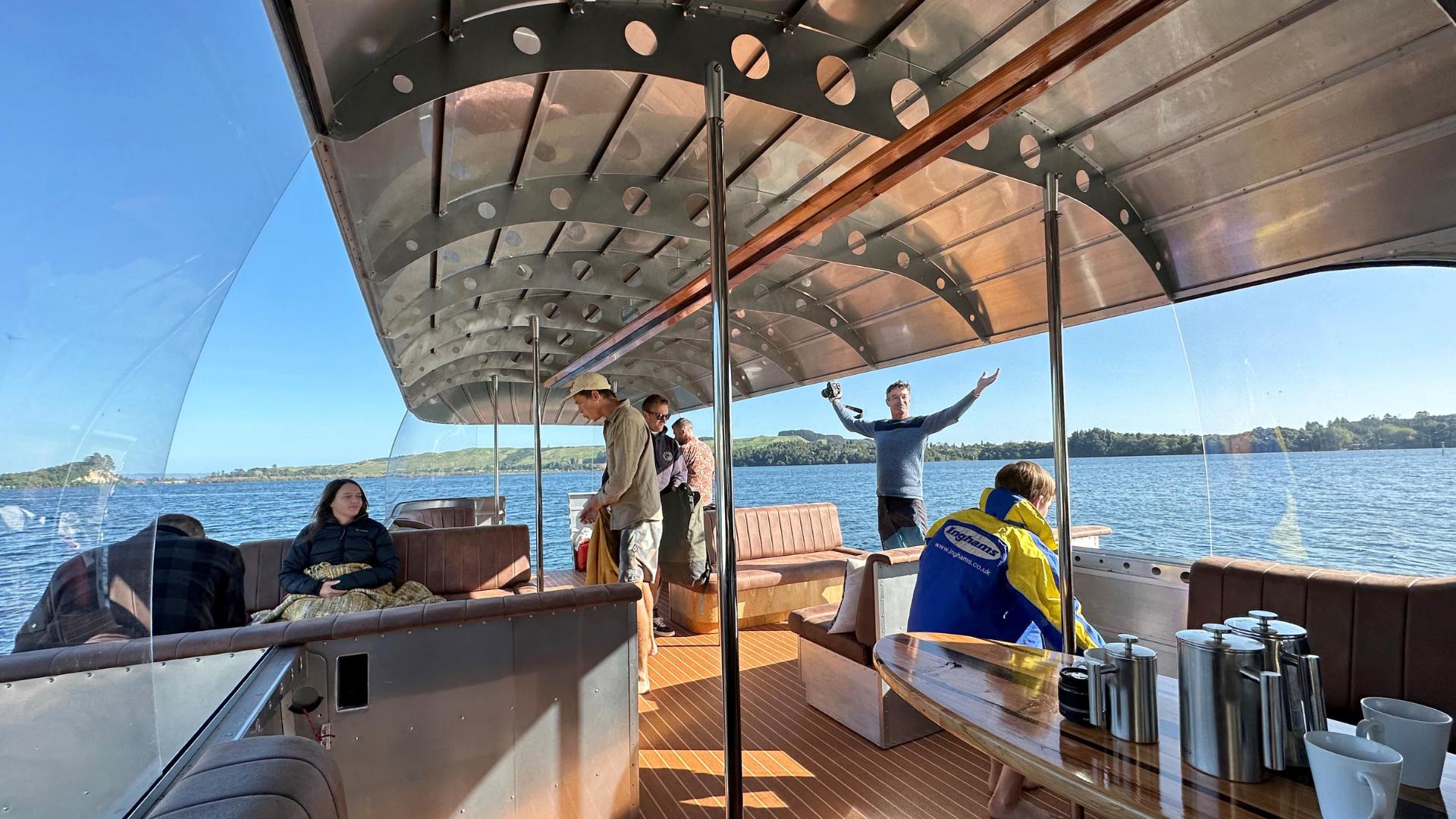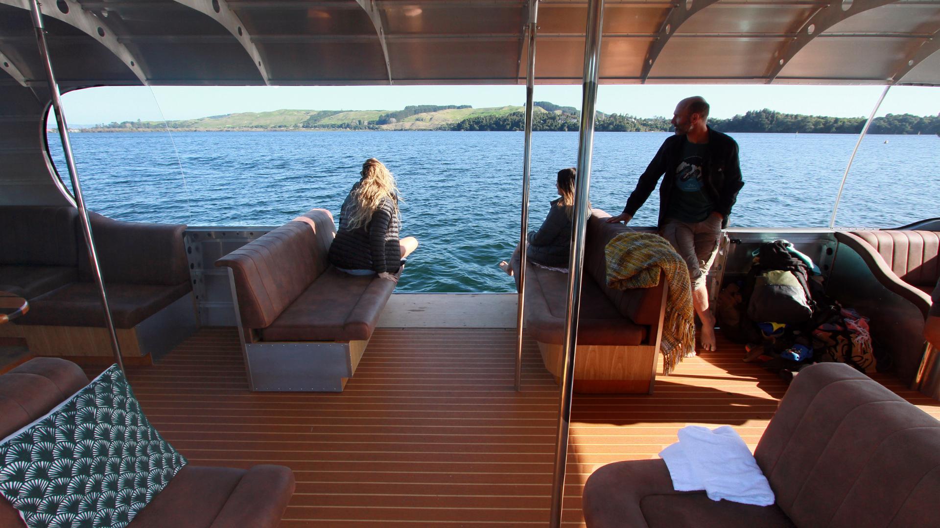 The sides fold out and allow the couches to pivot out over the water so you can get so much closer to the native bush, caves and thermal waters during your cruise on Lake Rotoiti.