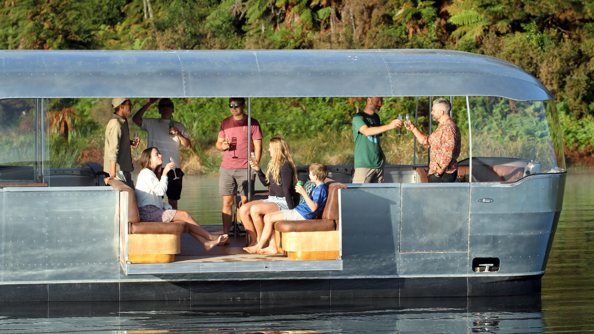 The clever owners of Pure Cruise have outdone themselves with this one! They have designed and hand built a unique 9.2-metre pontoon vessel – the shape, form and finish drawing inspiration from classic 1960s Airstream camping trailers, Second World War aircraft, and Italian speed boats!